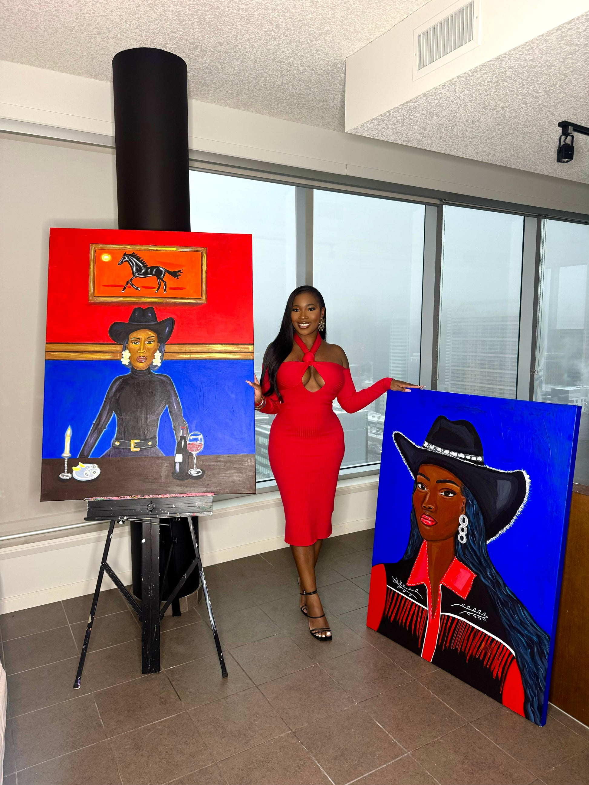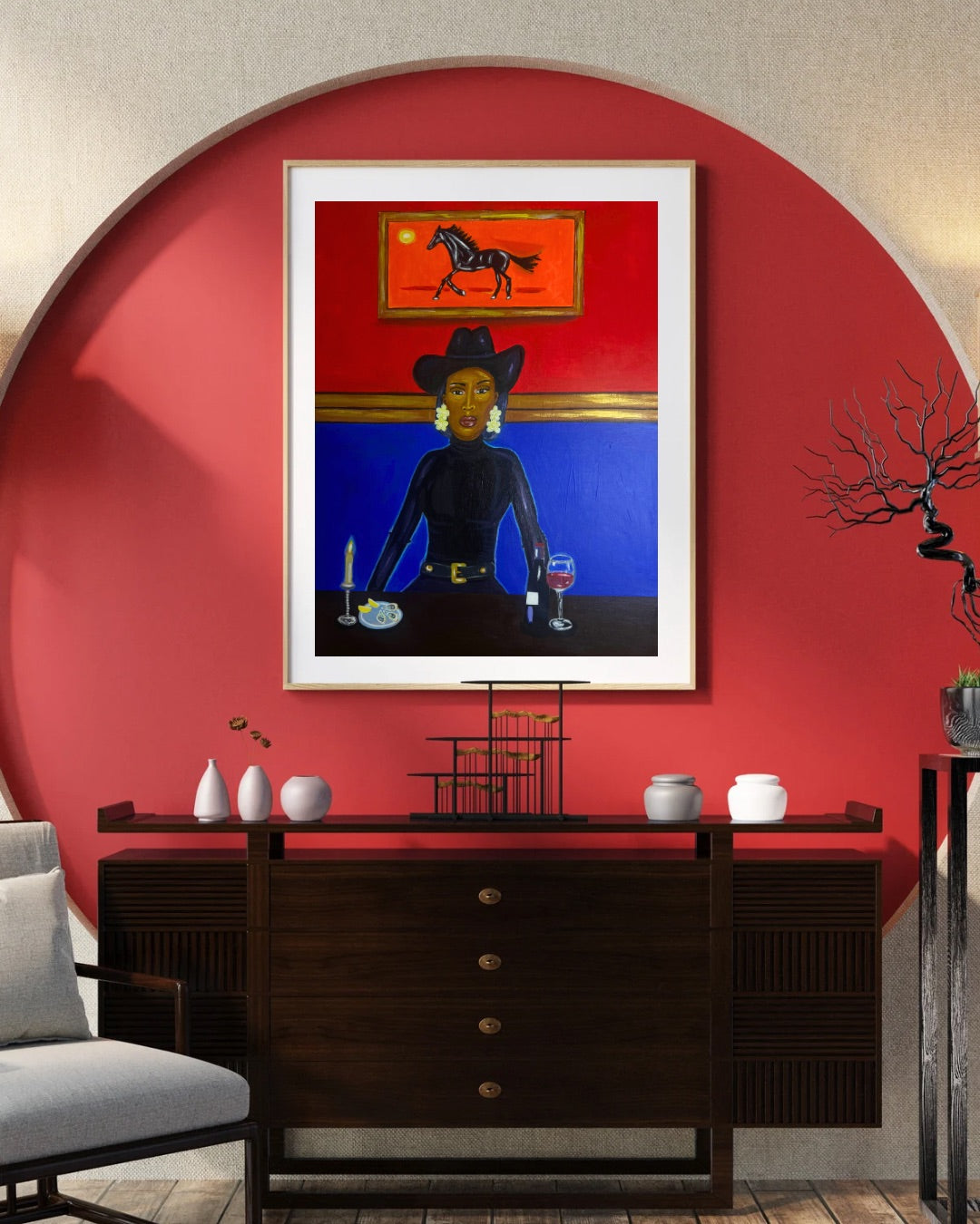Cowgirl’s supper captures a quiet moment at the end of a long day, as she settles into a booth with a glass of red wine and a simple meal. The painting invites you to pause with her and feel the calm that comes from choosing yourself.